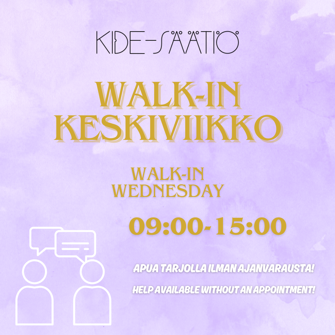 Keskiviikkoisin walk-in 9-15 välillä. LÄMPIMÄSTI TERVETULOA!