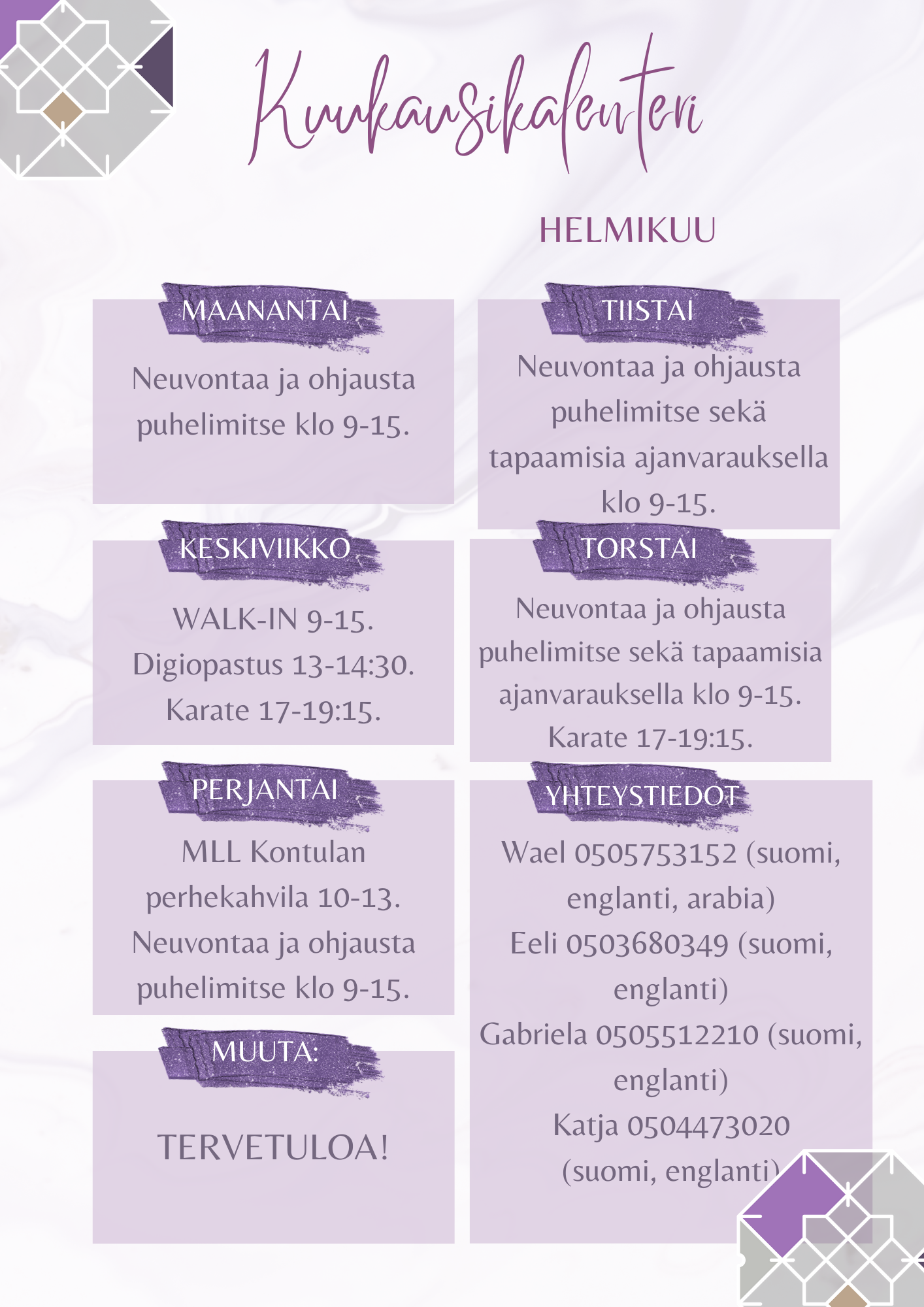 The Kide Foundation's Open Doors on Wednesdays are running as usual from 9am to 3pm. No appointment is needed on Wednesdays. Helsingin Työväenopisto Digital Guidance will be visiting the open doors from 11 September, 1pm-2.30pm. Digital advice available in English and Arabic.